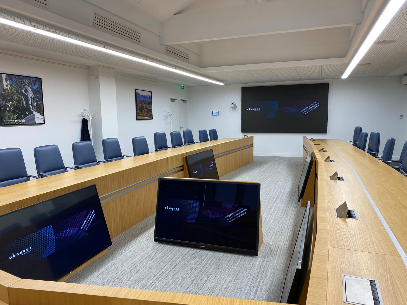 Le site de Pau, disposant déjà d’une solution de visioconférence, a souhaité moderniser sa salle de réunion avec des outils plus qualitatifs et ergonomiques et offrir une excellente qualité de diffusion. Les écrans géants LED offrant plus de flexibilité en matière de format, Abaques a mis en place un mur LED full HD pitch 1,5mm SAMSUNG afin d’optimiser la qualité d’image et de permettre d’y connecter plus facilement plusieurs sources et de diviser l’affichage.